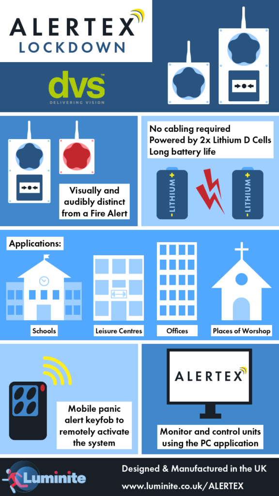 ALERTEX Lockdown units comply with Ofsted lockdown procedure guidelines that fall in line with advice from the National Counter Terrorism Office, which state that ‘the use of fire alarms should be avoided to reduce incorrect responses to an incident’.