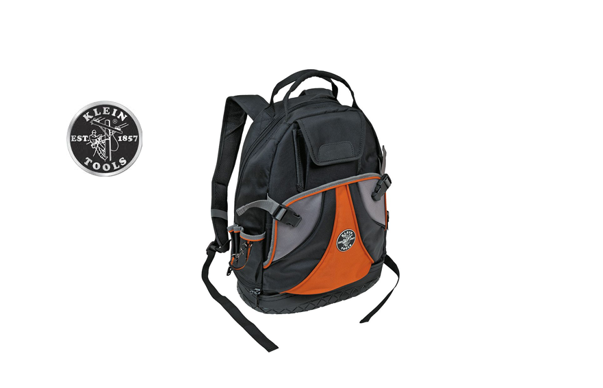 Klein Tools Backpack with 35 pockets of different sizes for easy organization, Tall interior pockets for long screwdrivers, Orange interior to find tools easily, Upper pocket holds cell phones, keys, etc, Front zipper pocket, material for durability, Bottom is constructed of a tough, diamond-textured coated material